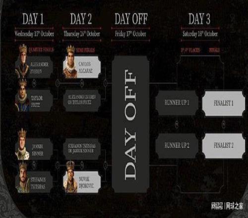 另外,沙特六王大满贯表演赛,北京时间昨晚公布了比赛的赛程。10月15日:兹维列夫vs弗里茨,辛纳vs西西帕斯;10月16日:阿尔卡拉斯vs兹维列夫与弗里茨之间的胜者,德约科维奇vs辛纳与西西帕斯之间的胜者;10月17日:休赛;10月18日:三四名决赛和冠亚军决赛。