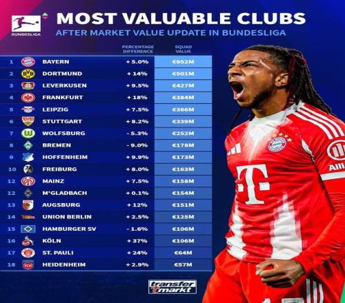 北京时间10月14日,在更新了德甲球员之后,德转还列出了德甲俱乐部的身价排行榜,拜仁慕尼黑以9.52亿欧元高居第一,多特蒙德5.01亿欧元第二,勒沃库森4.27亿欧元第三。