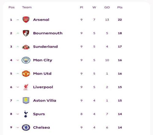 英超第9轮,积分榜形势大变。伯恩茅斯2比0力克正在经历赛季三次换帅阵痛的诺丁汉森林,各线连续7场不败,18分暂列积分榜第2,身后则是17分的升班马桑德兰,黑猫军团客场2比1爆冷击败豪门切尔西,迎来两连胜,将曼市双雄踩在脚下。