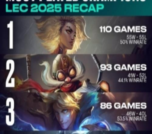 体育资讯12月6日称 LEC2025赛季回顾:选用最多次数的英雄芮尔&被禁最多次数的英雄大树。