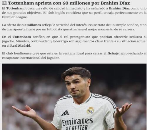 热刺相信,他们能为迪亚斯提供主力位置和核心角色,这将打动球员本人。出场时间、稳定性和领导地位,都是相比他在皇马目前处境更具吸引力的关键因素。热刺认为,现在是完成这笔签约的最佳时机,趁球员正在国际舞台上大放异彩。