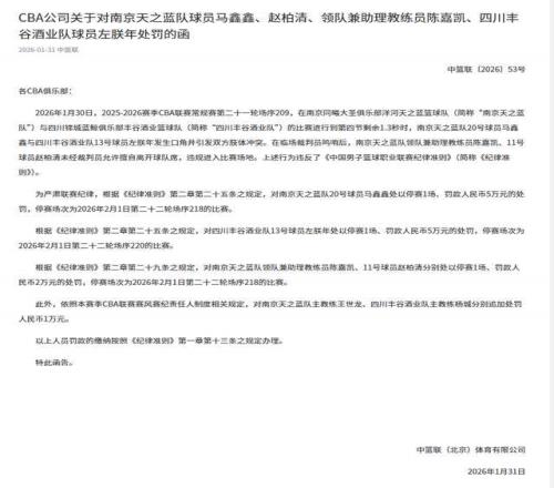 2月1日上午,CBA公司发布公告,因临近比赛结束时发生冲突,同曦男篮球员马鑫鑫被停赛1场且罚款人民币5万元;四川男篮球员左朕年被停赛1场且罚款人民币5万元;同曦男篮领队兼助教陈嘉凯、球员赵柏清分别被停赛1场且罚款人民币2万元;依照本赛季CBA联赛赛风赛纪责任人制度相关规定,同曦男篮主教练王世龙、四川男篮主教练杨城分别被追加处罚人民币1万元。